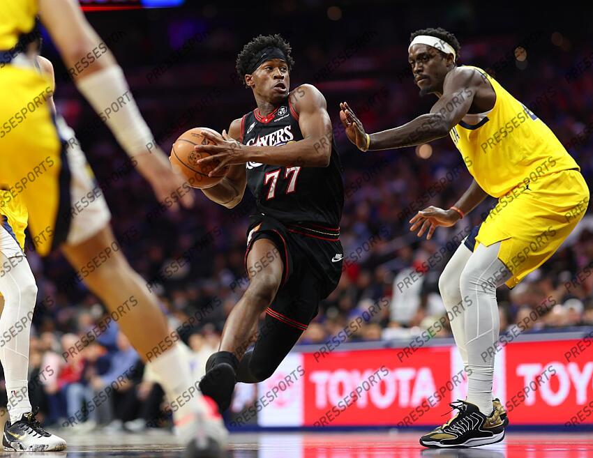 Dec 12, 2025; Philadelphia, Pennsylvania, USA; Philadelphia 76ers guard Vj Edgecombe (77) drives against Indiana Pacers forward Pascal Siakam (43) during the first quarter at Xfinity Mobile Arena. Mandatory Credit: Bill Streicher-Imagn Images NBA: Indiana Pacers at Philadelphia 76ers