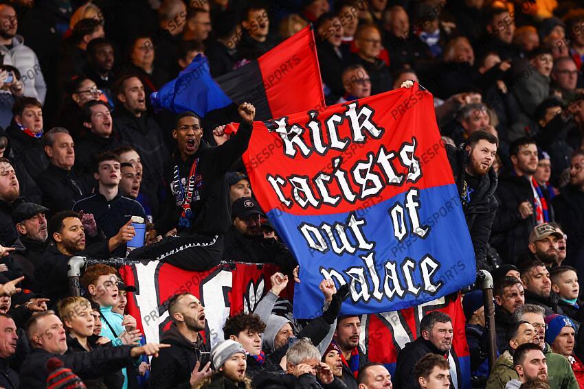 14 December 2025, London - Premier League Football - Crystal Palace v Manchester City - Crystal Palace fans hold up a sign saying "Kick racists out of palace" - Photo: Jacques Feeney / Offside. CRYSTAL PALACE-MANCHESTER CITY (0-3)