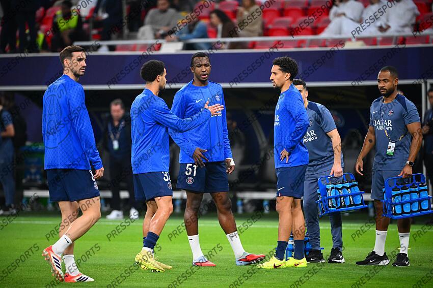 zaire emery (warren) pacho (willian) marquinhos FOOT COUPE INTERCONTINENTALE 2025 PSG-FLAMENGO (1-1 ; 2-1 tab) STADE AHMAD BEN ALI AL RAYYAN QATAR 17/12/2025 REAU ALEXIS ruiz (fabian) à gauche menage (edge) nutritionniste staff psg à droite