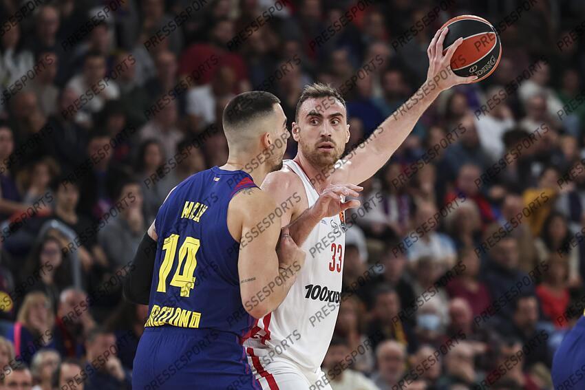Nikola Milutinov of Olympiacos Piraeus in action during the EuroLeague Regular Season Round 15 match played between FC Barcelona and Olympiacos Piraeus at Palau Blaugrana on December 12, 2025 in Barcelona, Spain. FC BARCELONE-OLYMPIAKOS