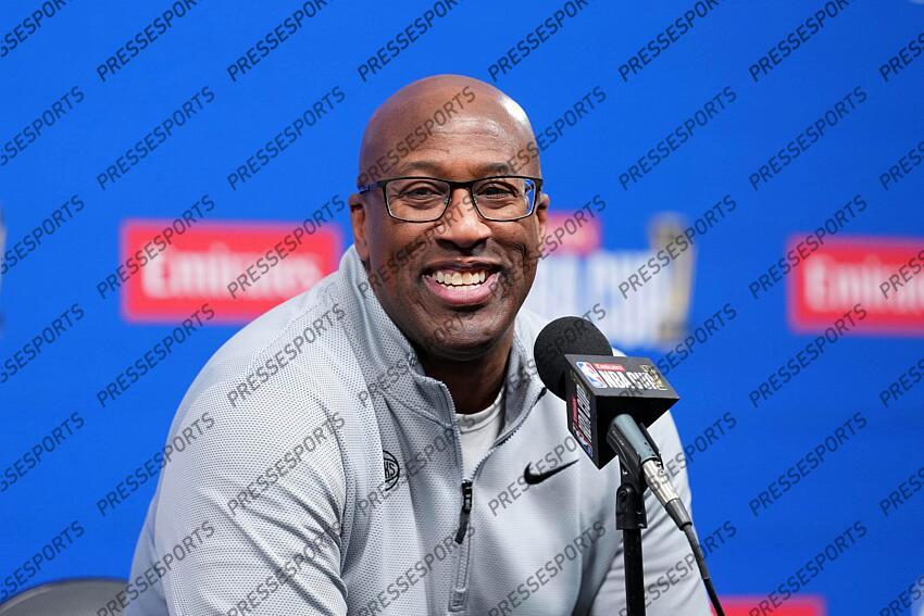 Dec 16, 2025; Las Vegas, Nevada, USA; New York Knicks Head Coach Mike Brown at press conference prior to the Emirates NBA Cup Final against the San Antonio Spurs at T-Mobile Arena. Mandatory Credit: Kirby Lee-Imagn Images Emirates Cup Championship-San Antonio Spurs at New York Knicks