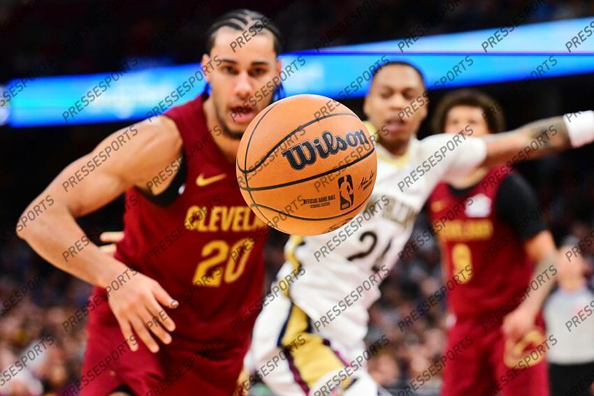 Dec 23, 2025; Cleveland, Ohio, USA; Cleveland Cavaliers guard Jaylon Tyson (20) and New Orleans Pelicans guard Jordan Hawkins (24) watch as the ball goes out of bounds during the second half at Rocket Arena. Mandatory Credit: Ken Blaze-Imagn Images NBA: New Orleans Pelicans at Cleveland Cavaliers