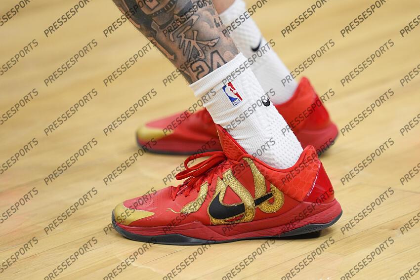 Dec 29, 2025; Toronto, Ontario, CAN; The shoes worn by Toronto Raptors forward Sandro Mamukelashvili (54) for a game against the Orlando Magic at Scotiabank Arena. Mandatory Credit: John E. Sokolowski-Imagn Images NBA: Orlando Magic at Toronto Raptors NBA: Orlando Magic at Toronto Raptors