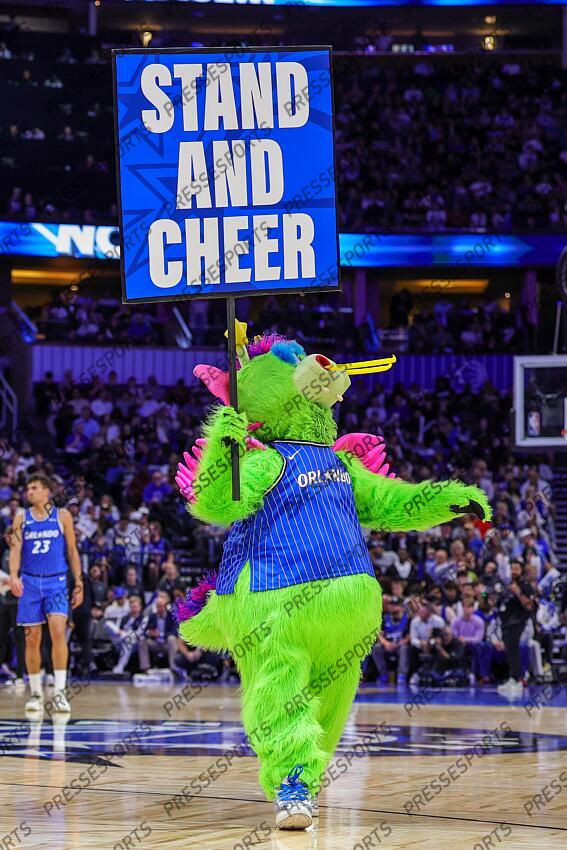 Dec 27, 2025; Orlando, Florida, USA; Orlando Magic mascot Stuff works the fans during the second half against the Denver Nuggets at Kia Center. Mandatory Credit: Mike Watters-Imagn Images NBA: Denver Nuggets at Orlando Magic NBA: Denver Nuggets at Orlando Magic
