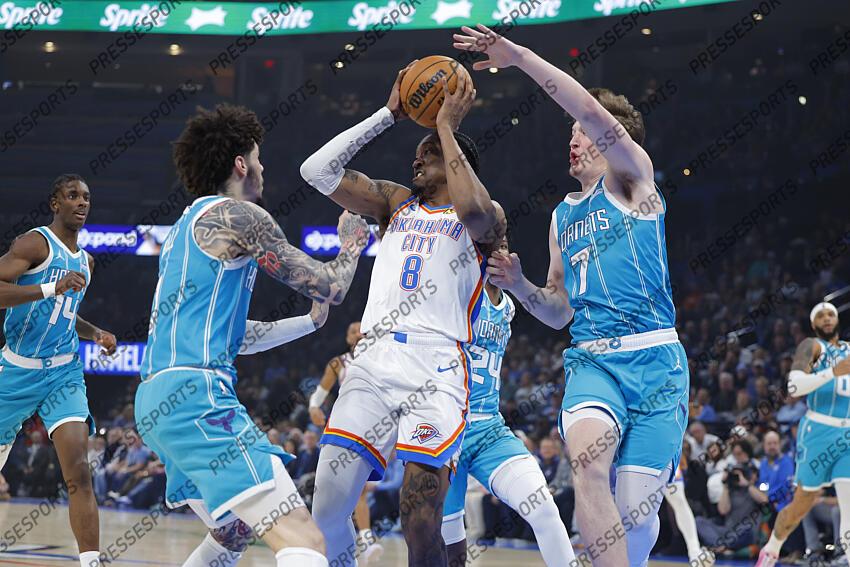 Jan 5, 2026; Oklahoma City, Oklahoma, USA; Oklahoma City Thunder guard Jalen Williams (8) passes between Charlotte Hornets guard Lamelo Ball (1) and guard Kon Knueppel (7) during the first quarter at Paycom Center. Mandatory Credit: Alonzo Adams-Imagn Images NBA: Charlotte Hornets at Oklahoma City Thunder