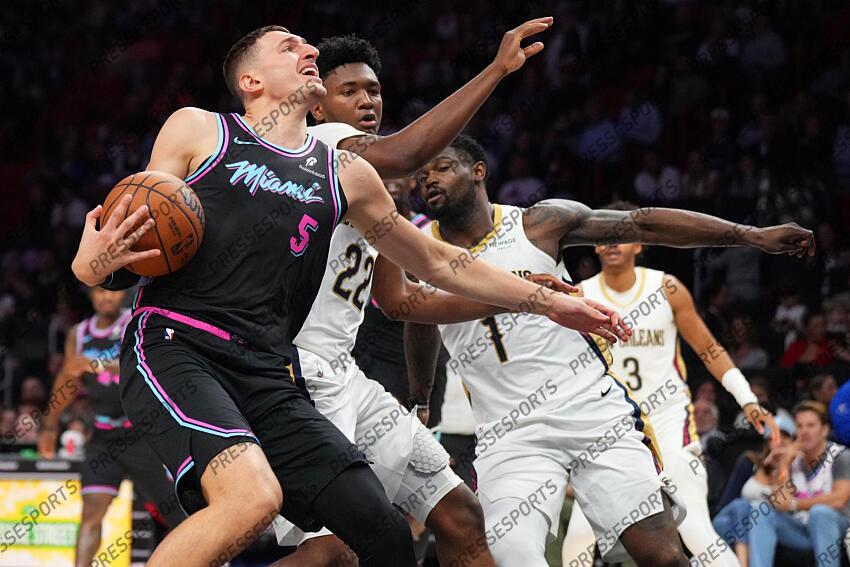 Jan 4, 2026; Miami, Florida, USA; Miami Heat forward Nikola Jovic (5) drives to the basket as New Orleans Pelicans center Derik Queen (22) and forward Zion Williamson (1) defend during the first half at Kaseya Center. Mandatory Credit: Jim Rassol-Imagn Images NBA: New Orleans Pelicans at Miami Heat
