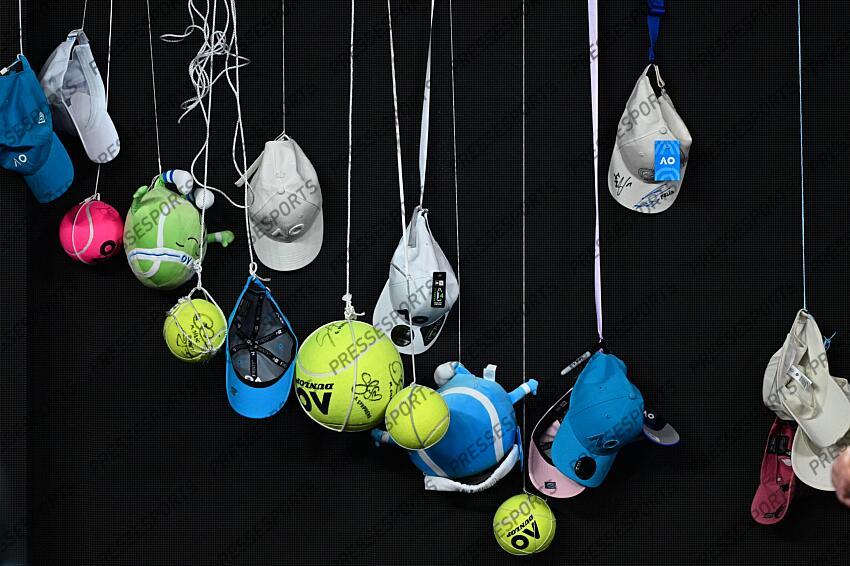TENNIS AVANT OPEN D'AUSTRALIE GRAND CHELEM 2026 ALCARAZ/WALTON ROD LAVER ARENA MELBOURNE AUSTRALIE 18/01/2026 LAHALLE PIERRE en attente d'autographe balle de tennis casquette