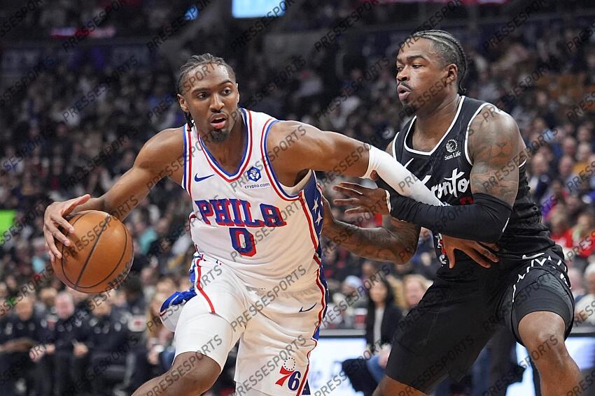 Jan 12, 2026; Toronto, Ontario, CAN; Philadelphia 76ers guard Tyrese Maxey (0) drives to the net against Toronto Raptors guard Jamal Shead (23) during the first half at Scotiabank Arena. Mandatory Credit: John E. Sokolowski-Imagn Images NBA: Philadelphia 76ers at Toronto Raptors