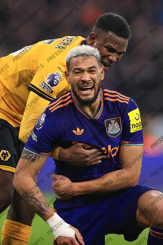18th January 2026 - Premier League - Wolverhampton Wanderers v Newcastle United - Joelinton of Newcastle United is consoled by Yerson Mosquera of Wolverhampton Wanderers - Photo: Simon Stacpoole / Offside. WOLVERHAMPTON WANDERERS-NEWCASTLE UNITED (0-0)