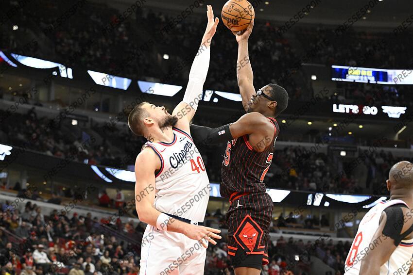 Jan 20, 2026; Chicago, Illinois, USA; Chicago Bulls forward Jalen Smith (25) shoots against LA Clippers center Ivica Zubac (40) during the second half at United Center. Mandatory Credit: Matt Marton-Imagn Images NBA: Los Angeles Clippers at Chicago Bulls