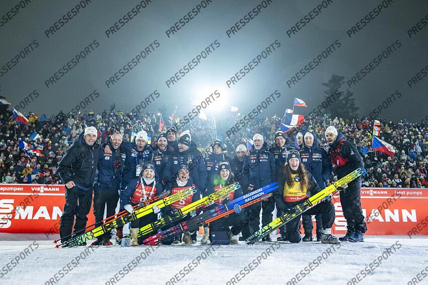 NOVE MESTO NA MORAVE, CZECH REPUBLIC - JANUARY 25: Julia Simon of Team France takes 1st place, Oceane Michelon of Team France takes 2nd place, Lou Jeanmonnot of Team France takes 4th place, Camille Bened of Team France takes 5th place during the Men and Woment Mass Start at the BMW IBU World Cup Biathlon on January 25, 2026 in Nove Mesto na Morave, Czech Republic. (Photo by Kevin Voigt/Agence Zoom) MASS START FEMMES NOVE MESTO