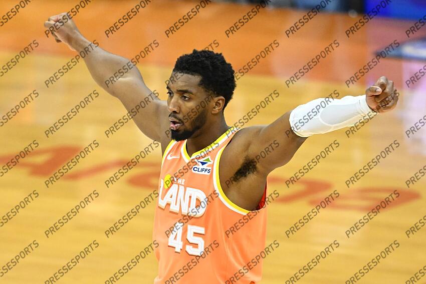 Jan 26, 2026; Cleveland, Ohio, USA; Cleveland Cavaliers guard Donovan Mitchell (45) stands on the court in the fourth quarter against the Orlando Magic at Rocket Arena. Mandatory Credit: David Richard-Imagn Images NBA: Orlando Magic at Cleveland Cavaliers