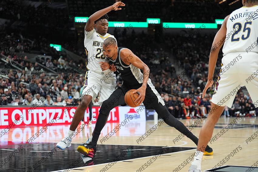 Jan 25, 2026; San Antonio, Texas, USA; San Antonio Spurs forward Victor Wembanyama (1) dribbles against New Orleans Pelicans center Derik Queen (22) in the first half at Frost Bank Center. Mandatory Credit: Daniel Dunn-Imagn Images NBA: New Orleans Pelicans at San Antonio Spurs