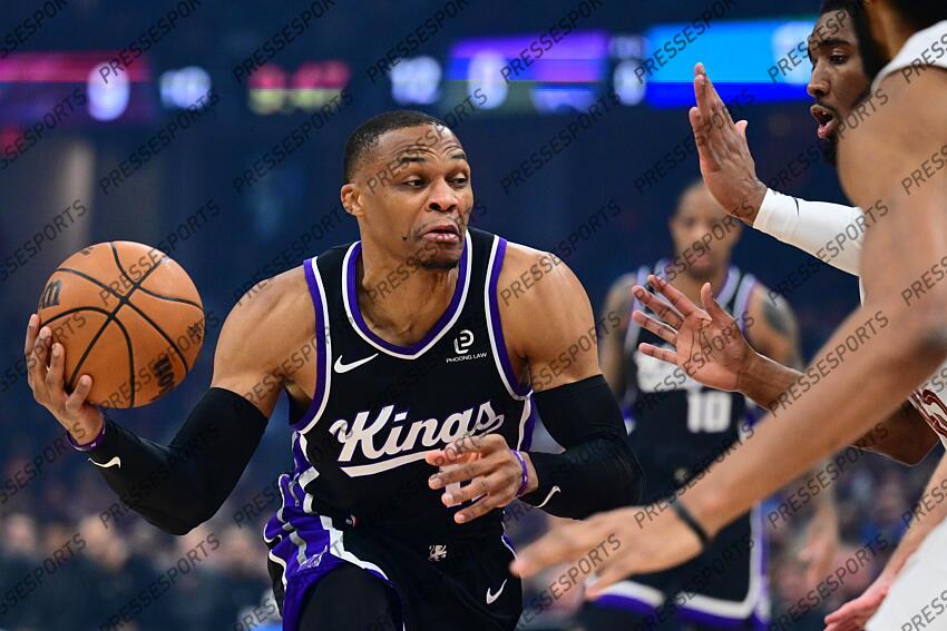 Jan 23, 2026; Cleveland, Ohio, USA; Sacramento Kings guard Russell Westbrook (18) drives to the basket against Cleveland Cavaliers guard Donovan Mitchell (45) during the first quarter at Rocket Arena. Mandatory Credit: Ken Blaze-Imagn Images NBA: Sacramento Kings at Cleveland Cavaliers