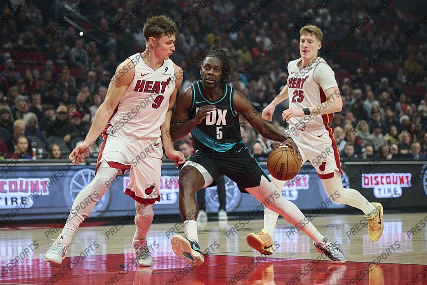 Jan 22, 2026; Portland, Oregon, USA; Portland Trail Blazers guard Jrue Holiday (5) drives to the basket during the first half against Miami Heat guard Pelle Larsson (9) at Moda Center. Mandatory Credit: Troy Wayrynen-Imagn Images NBA: Miami Heat at Portland Trail Blazers