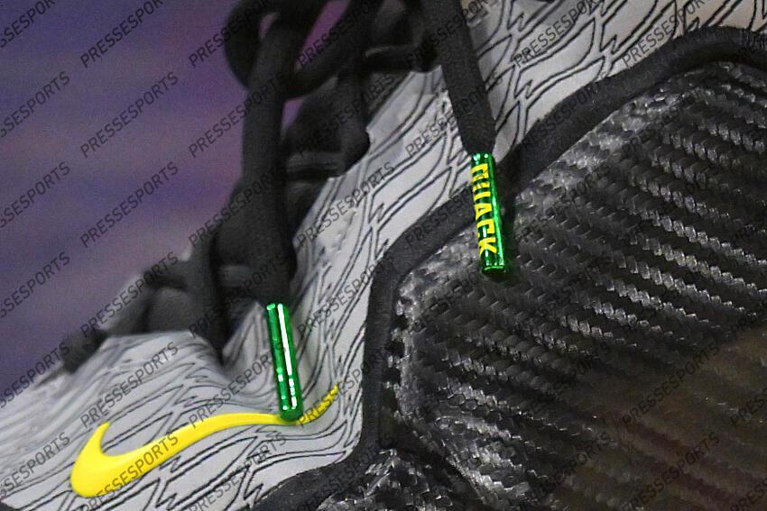 Jan 22, 2026; Inglewood, California, USA; Detailed view of the the word ?quack? on the laces of the basketball sneakers worn by Los Angeles Lakers forward LeBron James (23) against the Los Angeles Clippers at Intuit Dome. Mandatory Credit: Jayne Kamin-Oncea-Imagn Images NBA: Los Angeles Lakers at Los Angeles Clippers