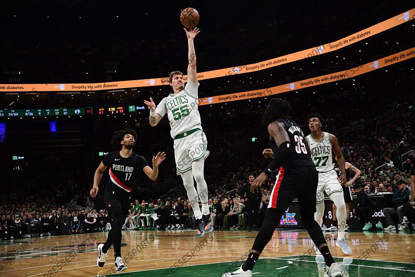 Jan 26, 2026; Boston, Massachusetts, USA; Boston Celtics guard Baylor Scheierman (55) shoots the ball while Portland Trail Blazers guard Shaedon Sharpe (17) and center Robert Williams III (35) look on during the second half at TD Garden. Mandatory Credit: Bob DeChiara-Imagn Images NBA: Portland Trail Blazers at Boston Celtics