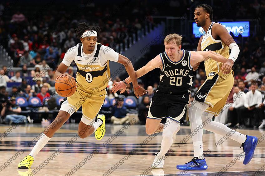 Jan 29, 2026; Washington, District of Columbia, USA; Washington Wizards guard Bilal Coulibaly (0) drives past Milwaukee Bucks guard AJ Green (20) during the second half at Capital One Arena. Mandatory Credit: Daniel Kucin Jr.-Imagn Images NBA: Milwaukee Bucks at Washington Wizards