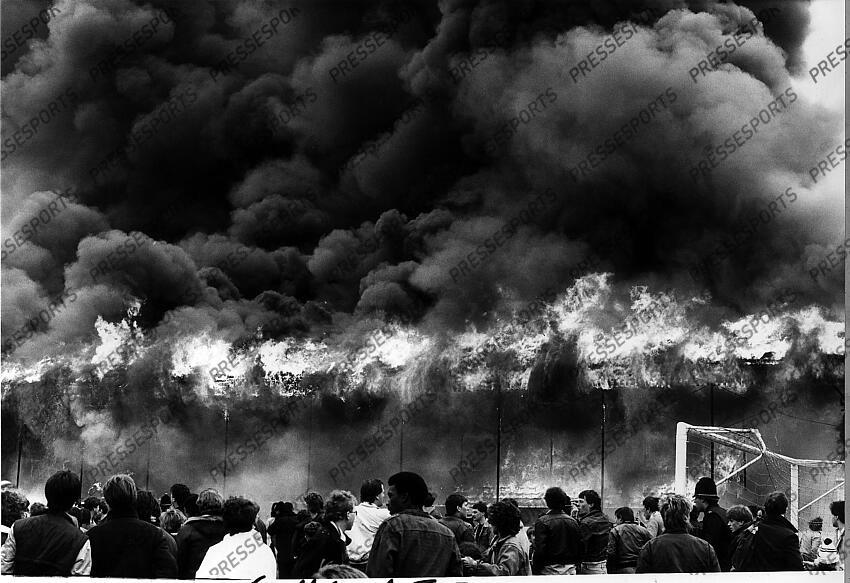Spectators watch as the 77 year old wooden main stand of the Valley Parade Stadium, home of Bradford football club, is engulfed in flames. The flash fire, started it is thought with a discarded cigarette, spread quickly killing 56 inside. 11th May 1985.