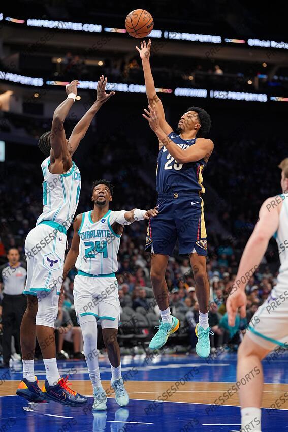 Feb 2, 2026; Charlotte, North Carolina, USA; New Orleans Pelicans forward Trey Murphy III (25) shoots the ball over Charlotte Hornets forward Moussa Diabate (14) during the first quarter at the Spectrum Center. Mandatory Credit: Jim Dedmon-Imagn Images NBA: New Orleans Pelicans at Charlotte Hornets NBA: New Orleans Pelicans at Charlotte Hornets