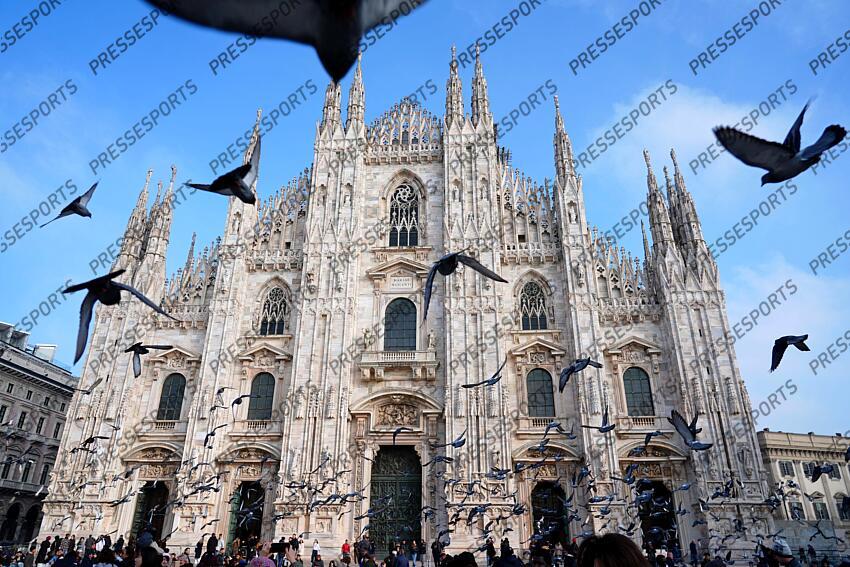 Feb 1, 2026; Milan, ITALY; A general view of pigeons flying in Piazza del Duomo in front of the Duomo di Milano ahead of the Milano Cortina 2026 Olympic Winter Games. Mandatory Credit: Jon Durr-Imagn Images PREVIEW JEUX OLYMPIQUES MILAN CORTINA