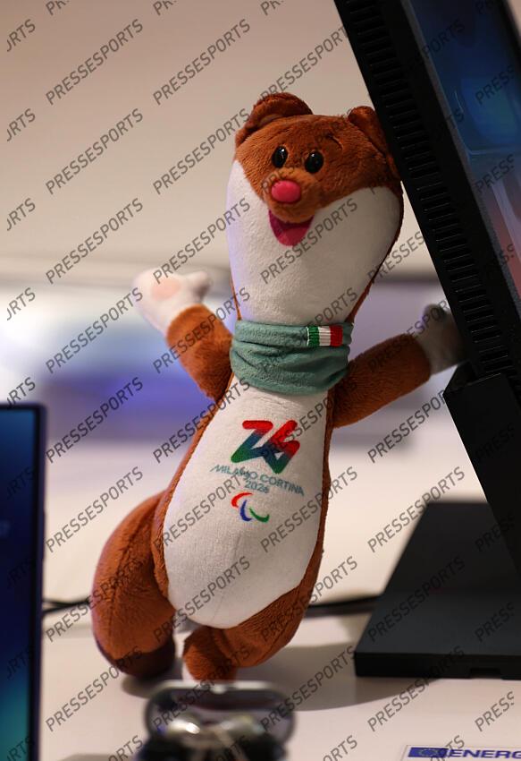 Einkleidung Team Deutschland Olympische Winterspiele, Olympia Hier im Bild eines der Maskottchen von Milano Cortina 2026, Olympiamaskottchen Dressing Team Germany Winter Olympics, Olympia Here in the picture one of the mascots of Milano Cortina 2026, Olympic mascot Milo l'hermine blanche et marron mascotte des jeux paralympiques de Milan Cortina PREVIEW JEUX OLYMPIQUES MILAN CORTINA