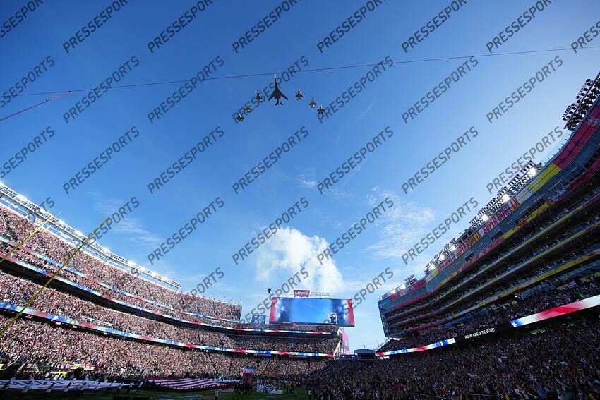 Feb 8, 2026; Santa Clara, CA, USA; The fly over during the National Anthem before the game between New England Patriots and Seattle Seahawks in Super Bowl LX at Levi's Stadium. Mandatory Credit: Darren Yamashita-Imagn Images avion NEW ENGLAND PATRIOTS-SEATTLE SEAHAWKS (13-29)
