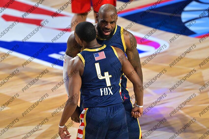 Feb 15, 2026; Inglewood, California, USA; Team USA Stripes forward LeBron James (23) of the Los Angeles Lakers celebrates with Team USA Stripes guard De'Aaron Fox of the San Antonio Spurs (4) after game two during the 75th NBA All Star Game at Intuit Dome. Mandatory Credit: Jayne Kamin-Oncea-Imagn Images NBA: 75th All Star Game NBA: 75th All Star Game