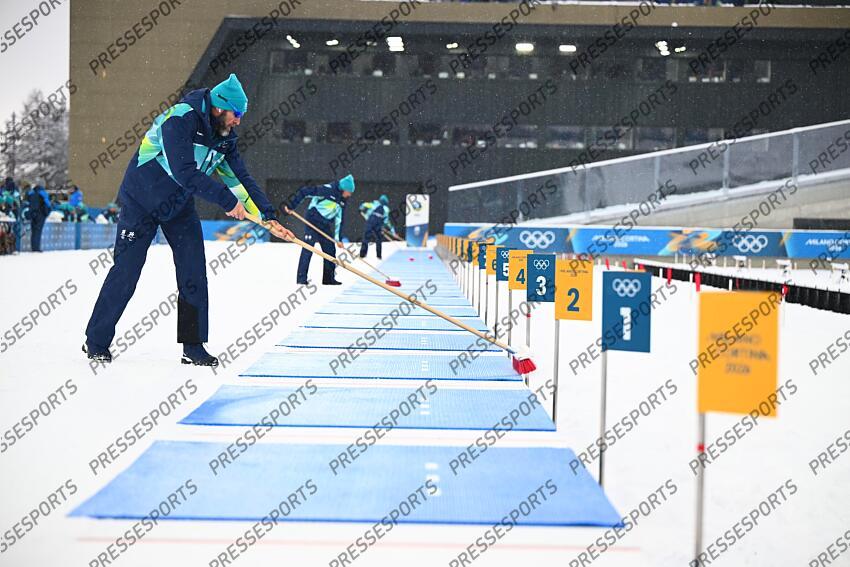 entretien du pas de tir apres une chute de neige BIATHLON JO MILAN CORTINA 2026 2026 RELAIS 4X7.5 KM HOMMES BIATHLON ARENA ANTHOLZ ANTERSELVA ITALIE 17/02/2026 GARNIER ETIENNE