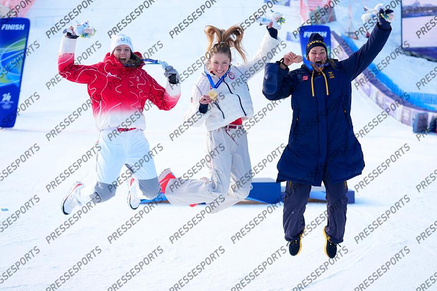 CORTINA D'AMPEZZO, ITALY - FEBRUARY 18: Camille Rast of Team Switzerland wins the silver medal, Mikaela Shiffrin of Team United States wins the gold medal, Anna Swenn Larsson of Team Sweden wins the bronze medal during the Women's Slalom Run on day twelve of the Milano Cortina 2026 Winter Olympics at Tofane Alpine Skiing Centre on February 18, 2026 in Cortina d'Ampezzo, Italy. (Photo by Agence Zoom/Agence Zoom) SLALOM FEMMES