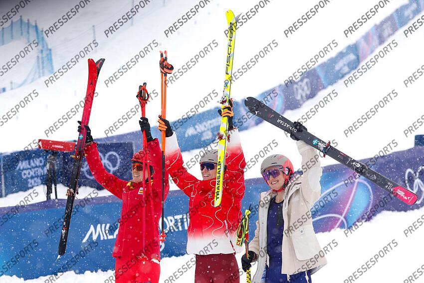 BORMIO, ITALY - FEBRUARY 19: Marianne Fatton of Team Switzerland wins the gold medal, Emily Harrop of Team France wins the silver medal, Ana Alonso Rodriguez of Team Spain wins the bronze medal on day thirteen of the Milano Cortina 2026 Winter Olympic games at Stelvio Alpine Skiing Centre on February 19, 2026 in Bormio, Italy. (Photo by Alexis Boichard/Agence Zoom) SPRINT HOMMES ET FEMMES