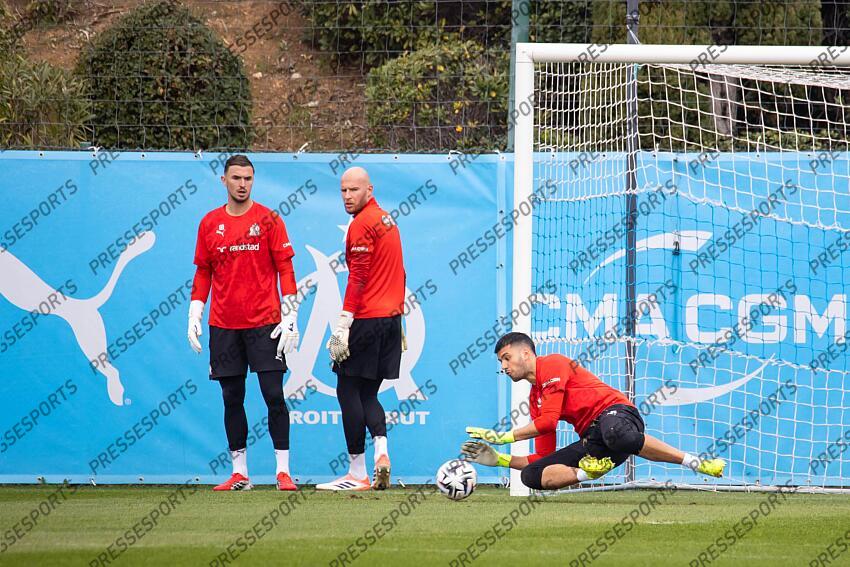 Football - 19/02/2026 - La Commanderie, Centre d'entraînement Robert Louis Dreyfus - 23e journée de Ligue 1 - Entraînement de l'OM Olympique de Marseille avant le match contre Brest - DE LANGE jeffrey, VERMOT théo, RULLI geronimo HABIB BEYE PRESENTATION OLYMPIQUE DE MARSEILLE