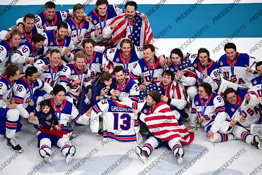 boldy (matt) - (usa) - 12 trocheck (vincent) - (usa) - 16 tkachuk (brady) - (usa) - 7 guentzel (jake) - (usa) - 59 - hanifin (noah) - (usa) -15 eichel (jack) - (usa) - 9 - tkachuk (matthew) - (usa) - keller (clayton) - (usa) - 91 - hellebuyck (connor) - (usa) -37 HOCKEY SUR GLACE JO MILAN CORTINA 2026 2026 CANADA-ETATS UNIS (1-2 ap) SANTAGIULIA ICE HOCKEY ARENA MILAN ITALIE 22/02/2026 PAPON BERNARD Equipe des Etats Unis championne olympique