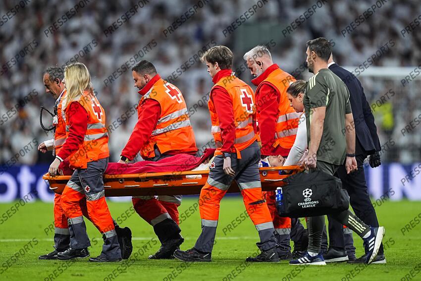 Raul Asencio of Real Madrid CF leaves the pitch after sustaining an injury during the UEFA Champions League 2025/26 KO play-offs Second Leg match between Real Madrid and SL Benfica at Bernabeu stadium on February 25, 2026, in Madrid, Spain. REAL MADRID-BENFICA (2-1)