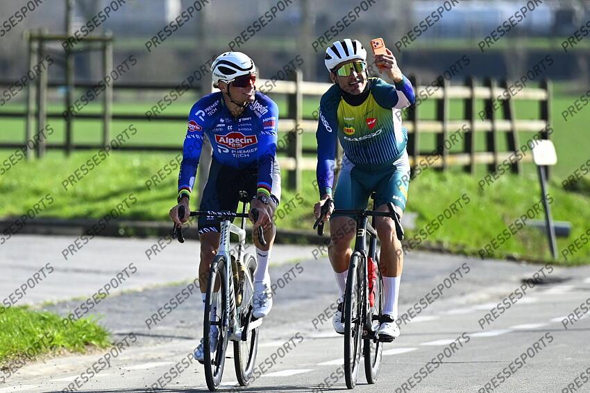 NINOVE, BELGIUM - FEBRUARY 26 : Van Der Poel Mathieu (NED) of Alpecin - Premier Tech and Van Avermaet Greg taking a selfie during a training and reconnaissance session prior to the 81th edition of Omloop Het Nieuwsblad an UCI World Tour 1.UWT one day cycling road race for Men Elite of km with start in Ghent and finish in Ninove on February 26, 2026 in Ninove, Belgium, 26/02/2026 ( Motordriver Guy De Vuyst - Photo by Tomas Sisk / Photonews ENTRAINEMENT AVANT LE OMLOOP HET NIEUWSBLAD