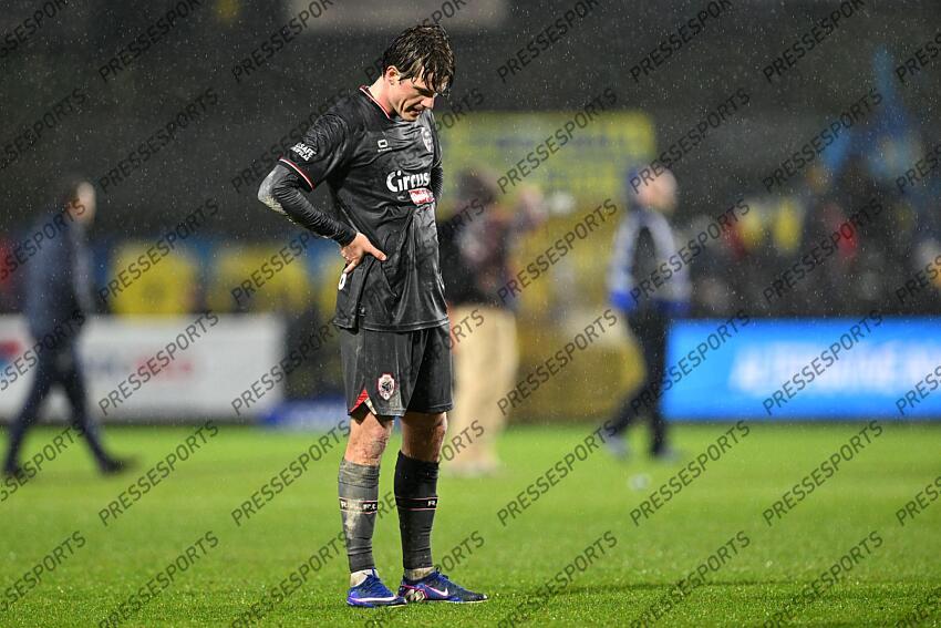Daam Foulon (5) of Antwerp looking dejected and disappointed during the Jupiler Pro League season 2025 - 2026 matchday 26 game between Royale Union Saint-Gilloise and Royal Antwerp FC on February 21 , 2026 in Vorst, Belgium. (Photo by David Catry / Isosport) UNION SAINT GILLOISE-ROYAL ANTWERP (2-1)