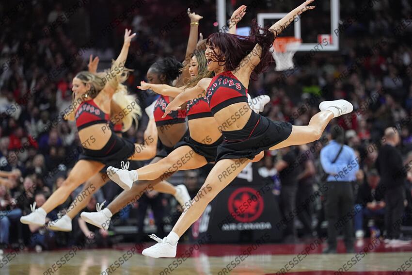 Mar 3, 2026; Toronto, Ontario, CAN; The Toronto Raptors dance team performs during a break in the action against the New York Knicks during the second half at Scotiabank Arena. Mandatory Credit: John E. Sokolowski-Imagn Images NBA: New York Knicks at Toronto Raptors