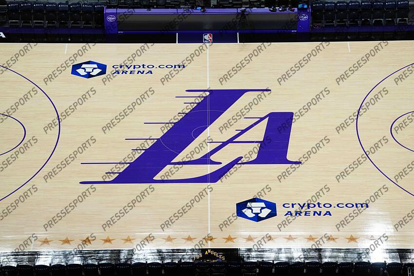 Mar 3, 2026; Los Angeles, California, USA; A general overall view of the Los Angeles Lakers city edition logo at midcourt at Crypto.com Arena. Mandatory Credit: Kirby Lee-Imagn Images NBA: New Orleans Pelicans at Los Angeles Lakers