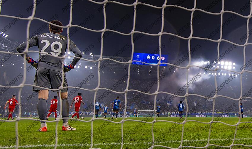 10.03.2026, Fussball UEFA Championsleague 2025/2026: Achtelfinale, Atalanta Bergamo - FC Bayern M?nchen, in der New Balance Arena Bergamo, Italien, Torwart Marco Carnesecchi Atalanta Bergamo steht geschockt da, nach dem erneuten Gegentor, es steht 0:6. 10 03 2026, Football UEFA Champions League 2025 2026 Round of 16, Atalanta Bergamo FC Bayern Munich, in the New Balance Arena Bergamo, Italy , Goalkeeper Marco Carnesecchi Atalanta Bergamo stands shocked after conceding another goal, the score is 0 6 ATALANTA BERGAME-BAYERN MUNICH (1-6)