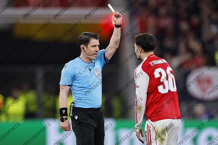 LEVERKUSEN – (L-R) Referee Umut Meler, Martin Zubimendi of Arsenal FC during the UEFA Champions League match between Bayer 04 Leverkusen v Arsenal at the BayArena on March 11, 2026 in Leverkusen, Germany. BART STOUTJESDIJK / ANP BAYER LEVERKUSEN-ARSENAL (1-1)