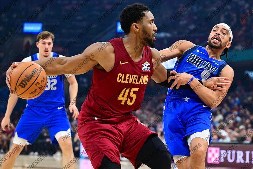 Mar 15, 2026; Cleveland, Ohio, USA; Cleveland Cavaliers guard Donovan Mitchell (45) drives to the basket against Dallas Mavericks guard Ryan Nembhard (9) during the second half at Rocket Arena. Mandatory Credit: Ken Blaze-Imagn Images NBA: Dallas Mavericks at Cleveland Cavaliers