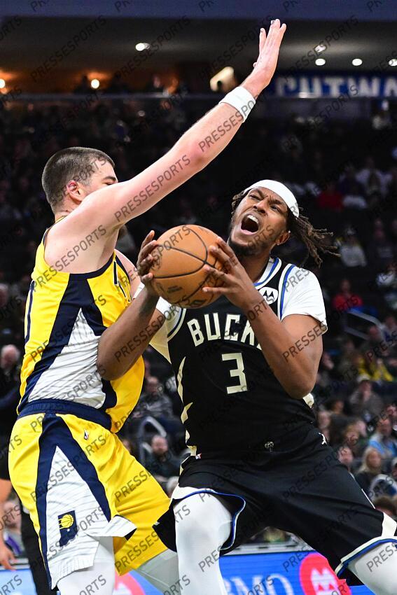 Mar 15, 2026; Milwaukee, Wisconsin, USA; Milwaukee Bucks center Myles Turner (3) looks for a shot against Indiana Pacers center Ivica Zubac (40) in the second quarter at Fiserv Forum. Mandatory Credit: Benny Sieu-Imagn Images NBA: Indiana Pacers at Milwaukee Bucks