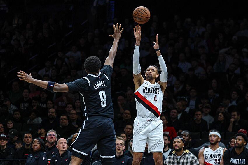 Mar 16, 2026; Brooklyn, New York, USA; Brooklyn Nets guard Drake Powell (4) shoots the ball as Brooklyn Nets forward E.J. Liddell (9) defends during the first half at Barclays Center. Mandatory Credit: Vincent Carchietta-Imagn Images NBA: Portland Trail Blazers at Brooklyn Nets