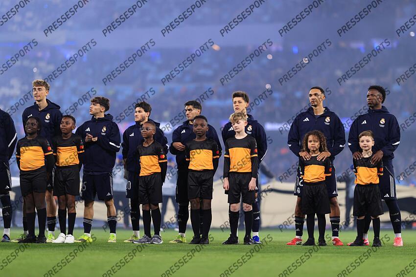 17th March 2026 - UEFA Champions League - Round of 16 (2nd Leg) - Manchester City v Real Madrid - Real Madrid players stand behind their mascots - Photo: Simon Stacpoole / Offside. MANCHESTER CITY-REAL MADRID (1-2)