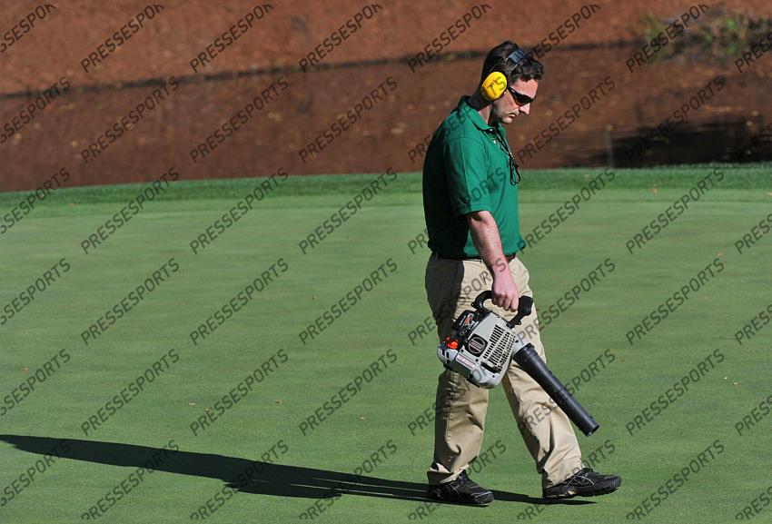 Apr 10, 2013; Augusta, GA, USA; A course worker blows leaves off the 8th green during the Par 3 Contest before the 2013 The Masters golf tournament at Augusta National Golf Club. Mandatory Credit: Michael Madrid-USA TODAY Sports