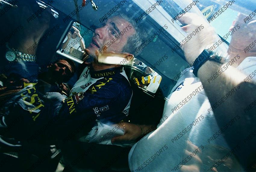 virenque (richard) CYCLISME TOUR DE FRANCE 1998 le samedi 18 juillet 1998. Richard Virenque submergé par l’émotion dans une voiture Festina au départ de l’hôtel le Castel Novel à Varetz en Corrèze où lui et son équipe logent. Virenque et ses coéquipiers s’apprêtent à se rendre à Corrèze-la-Gare, Chez Gillou, un bistrot-tabac-presse où ils ont rendez-vous dans un premier temps avec Jean-Marie Leblanc, directeur général du Tour de France, venu leur adresser un « au revoir » et où par la suite Virenque s’adressera aux journalistes. AFFAIRE FESTINA